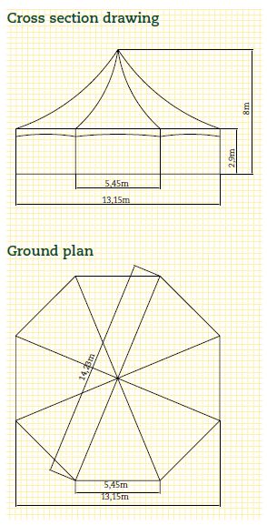 With a unique octagonal shape and a romantic flair, the Nevada is an excellent eye-catcher. With its unique octagonal shape and a romantic flair, the Nevada is an excellent eye-catcher at any event. Its lightweight aluminium frame and taut roof fabric are an example of cutting edge tent technology. All Nevadas can be connected to each other which means they can adjust easily to the size of your event.
