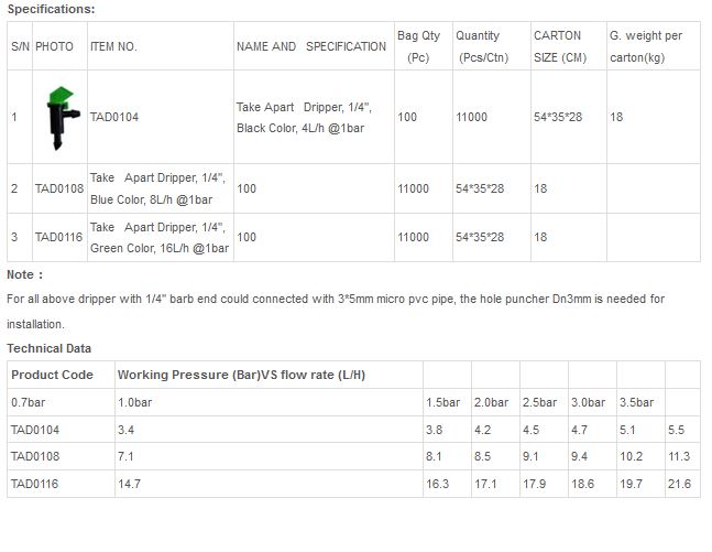Features: Made from virgin Polypropylene (PP), chemical corrosion resistant, ultraviolet ray resistant and aging resistant. Unique wide or turbulent flow passageway ensures rated water flow and good clogging resistance. Easy dismantlement and cleaning for detachable and washable drippers. Stable flow rate at recommended pressure range: 1-1.5bar. It can be connected to arrow dripper with Dn5mm PVC soft pipe, or can be directly installed on Dn12-32mmLDPE pipe with the hole punch. It can be installed flexibly according to different crop distance, widely used in plants of many years` growth, such as tress and grapes