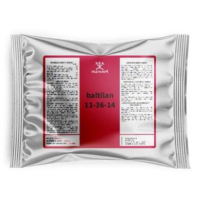 Manvert baltilan 11-36-14 is a NPK fertilizer in solid form, which by its high content of phosphorus, favours the processes related to rooting, flowering and fruit set. Due to its balance of macro and microelements it is a nutritional supplement for cultivation, increasing production and quality. It can be applied as a foliar spray or by fertigation systems.