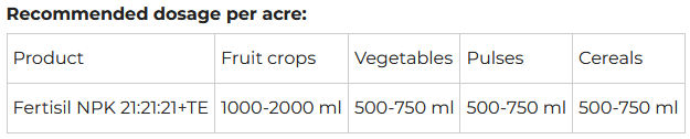 Fertisil NPK: 21:21:21+TE reduces water hardness of the spray solution, as the product has a strong resistance to deposition and is corrosion resistant, hence the drip irrigation pipes or spraying machineries and the nozzles are not susceptible to corrosion or deposition which is a huge advantage for the farming community. Fertisil NPK: 21:21:21+TE available in 5 Ltr. 2 Ltr & 1 Ltr packing.