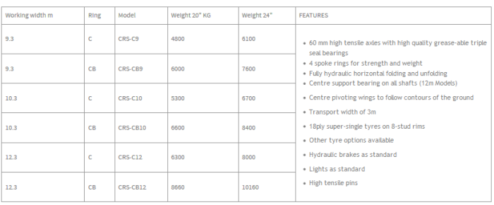 A high quality range of hydraulic folding rollers available from 4.3m to 12.3m- 20 and 24 inch diameter rings, plain Cambridge or Cambridge breaker. All models are fully hydraulic, no reversing to unfold or bars to remove and are horizontal in transport. Made in the UK from top quality materials, they are designed for long life with minimum maintenance.