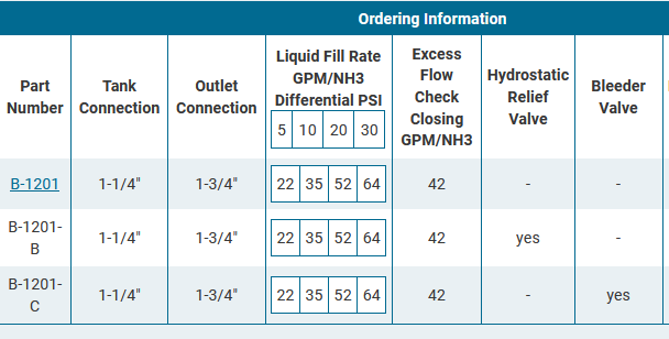 B-1201 is a high flow, manual shutoff valve for applicator and nurse tanks. It is designed for use as a filler, liquid or vapor withdrawal valve. The rugged ductile iron body is an assurance of durability and a long service life. The built-in excess flow check assembly provides maximum safety in the event of an accidental hose break.