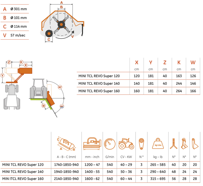 Professional flail mower with variable trim. The offsetting flailmower MINI TCL REVO SUPER is designed for being used in such works as the mowing of the grass and of small little wood, for high efficiency demands of productivity, quality of work and trustworthiness. Thanks to the hydraulic shifts is possible to work even out of the tractor shape and on dikes, banks and ditches. Thanks to the particular lightness, the machine can easily be used for carrying out such jobs as gardening and maintenance on all the types of soil and in particular on hills and slopes. Available in versions: 120-140-160. MINI TCL REVO SUPER: 40 – 60 CV.