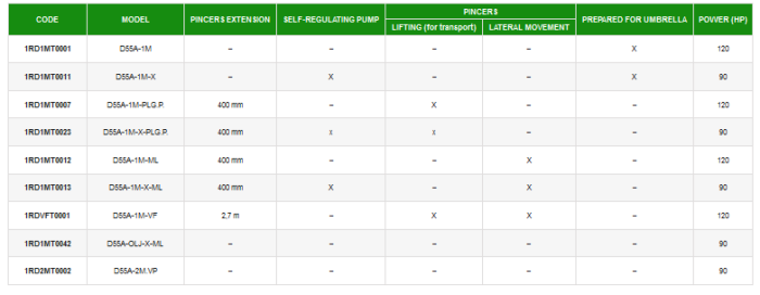 Hydraulic central hitched on the rear 3 points of the tractor with fast coupling plugs and counter-weight. Piston hydraulic system. Fast system to hitch/unhitch the inverted umbrella (not possible for all models – consult us). Protection pieces for the hydraulic cylinder of opening/closing of pincers. System of orbital and multiple vibrations in two directions. In-cab electrical control box. Elevation movement of pincers. 35º transversal orientation movement of pincers.