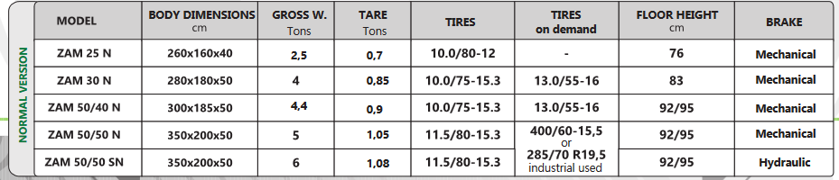 Standard equipment: Trilateral hydraulic tipping. Regulatory electrical system. N.4 winches. Manual parking stand. Tube with coupling for hydraulic tipping. Extension sides attachments. N.2 tubes for front poles. Rear columns. Downwards/upwards opening of the rear side. Cold-galvanized sides. Under-chequered metal sheet floor. Mechanical or hydraulic brake.