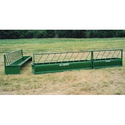 Designed for mature stock and feeder calves. Use as a fence-line or loafing shed feeder. Slant bars reduce tossed feed. Feed saving edge both front and back. Rigid kick panel for easy, quick cleaning. End flanges allow for multiple length connections. Just put the left end over the right.