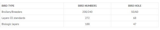 The automatic egg collection is made by means of two thick, self-cleaning polypropylene belts, duly holed to prevent eggs from rolling.