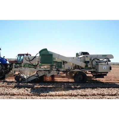 The Top Air Onion Digger Series of harvesters has become a popular solution to undercutting onions in the southern United States. As this area is subject to frequent rains during the harvest season, the onions are best undercut and placed on top of a firm bed. Top Air diggers accomplish this by first undercutting with a blade. Then, conveying the onions up a belted chain bed to remove soil from the roots, which allows for better curing. Then, firming the soil with a roller, which allows rain water to run off the bed. The onions are then laid back on to a firm bed. This method allows the soil free roots and tops to dry in these difficult climatic conditions.