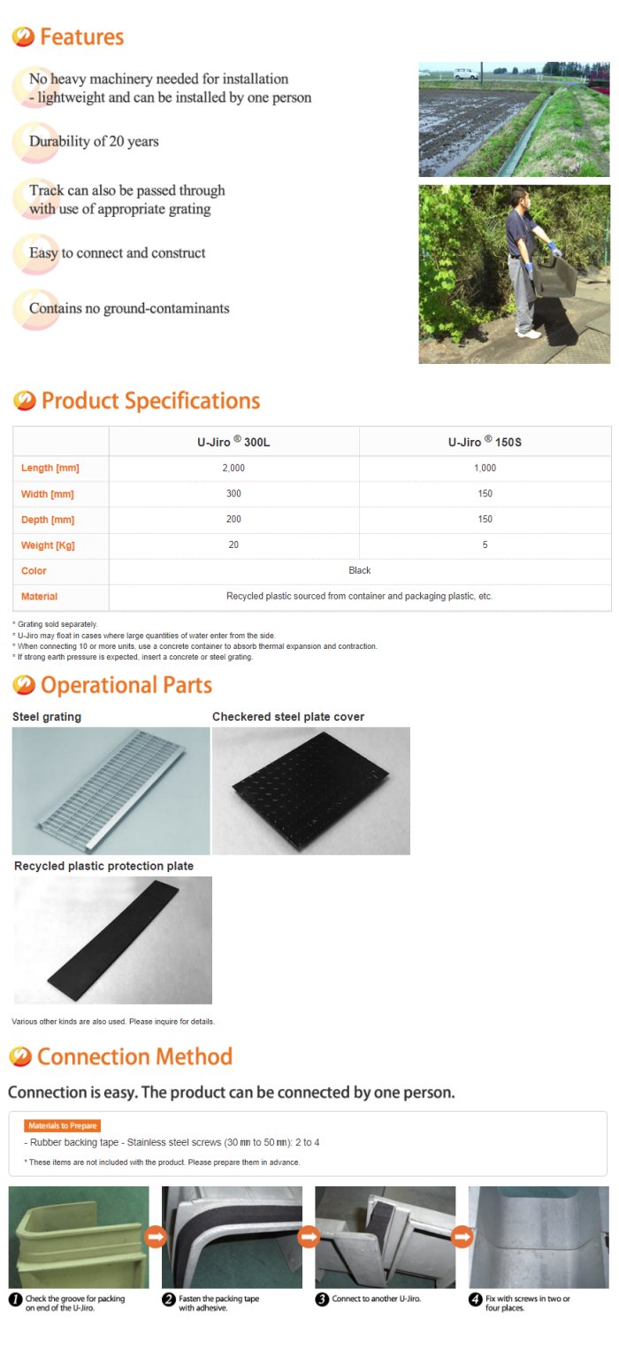 Lightweight plastic U-shaped guttering can be installed without using heavy machinery. U-Jiro is a lightweight plastic U-shaped guttering that can be installed without using heavy machinery. Easy to construct and install, it is a low-cost product that can be applied in a short time frame. Applications include rain water drainage for temporary housing, cable troughs for electric power stations, irrigation channels around paddy fields, and many other places. The product is also environmentally friendly with a durability of 20 years.