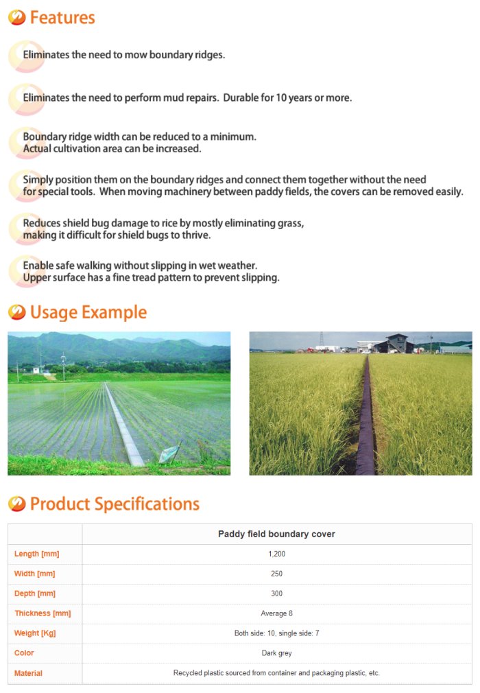 "Paddy Field Boundary Ridge Covers" are made of recycled plastic and eliminate the need for mowing. Simply position them on the boundary ridges and connect them together without the need for special tools. When moving machinery between paddy fields, the covers can be removed easily. Lightweight, making the installation work easy. Eliminates the need to mow ridges four to five times a year.