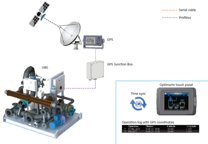 Connecting the Optimarin Ballast Water Treatment System to an GPS source onboard, provides the opportunity for logging of coordinates for each operation. The Optimarin BWTS time and date can also be automatically synchronized with the vessels GPS time.