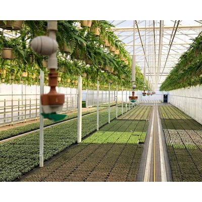 Simple to install, this system hangs from a guidewire installed in the middle of the bench or house overhead. Nozzles located at 3-foot intervals disperse water at a 95% uniformity and are available for mist or irrigation.