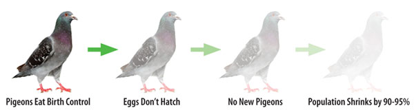 - Material: General use pesticide, doesn`t hurt birds, just stops eggs from hatching. Like birth control for pigeons.