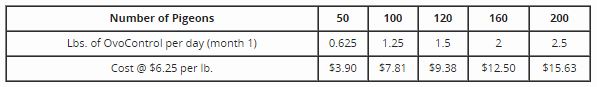 Bait requirements decline in parallel to the pigeon population. Therefore, following the gradual reduction, after 12 months on the program, pigeon numbers have been reduced to 50 and the bait requirement reduced to 50/80 or 0.625lbs, per day. The following table provides an illustration:
