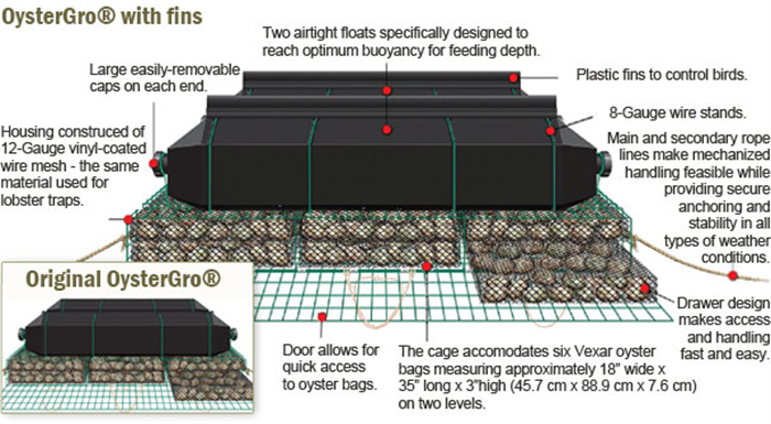 At its core, OysterGro consists of a compact wire mesh housing with two specially designed floats that provide an ideal, versatile environment for the growth, cleaning, sorting, protection and survival of oysters in a farming environment.