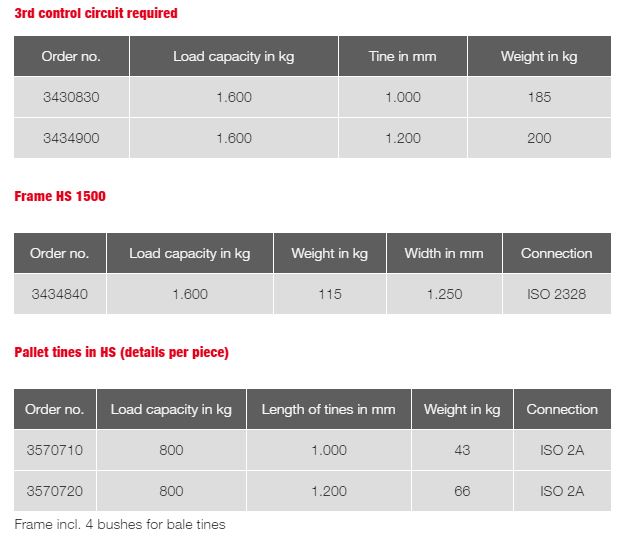 Up to four bale tines can be mounted on the frame in addition to the pallet fork tines.