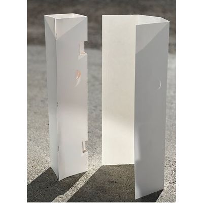 Paper plant protectors. Recyclable/biodegradable. These unsealed protectors are white, poly-coated paper(milk carton-like material) with a 3.75" diameter. They include a pop-out stake slot for bamboo or metal stakes and a tie hole as well. Great for vine protection and tree protection on plants that already have established canopy/growth. Used to protect plants from herbicide overspray, sun, and wind. They also provide a micro-environment which supports the transition of plants from nursery to field.
