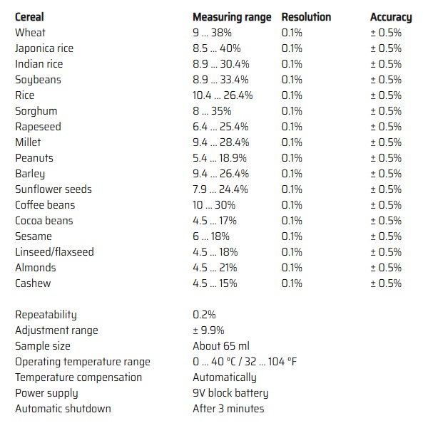automatic temperature compensation / manual measurement correction possible / whole grain measuring device
