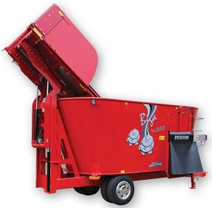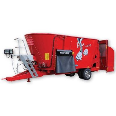 Standard equipment: Lift-system on which you can attach several diflerent loading mechanisms. It is an extension on our Peecon Biga vertical feed mixers. When buying a vertical feed mixer with a Multilift-system, following adaptations are made: The chassis is extended and strengthened. The axle is moved. The tub has a window in the front. Two vertical beams are attached to the chassis in a fixed position. A lift-cart with rollers which is available in three different elevation positions. A125 degree tilting frame that, when in the upper position, is activated by the sequential function. A three-point hitch with rubber suspension.
