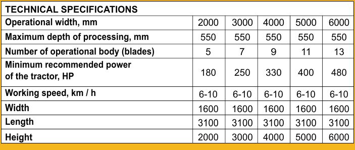 The sub soiler is offered with operational width from 2 m to 6 m, and is attached to tractors with power from 150 hp to 500 hp. The operational depth of the equipment is up to 550 mm.