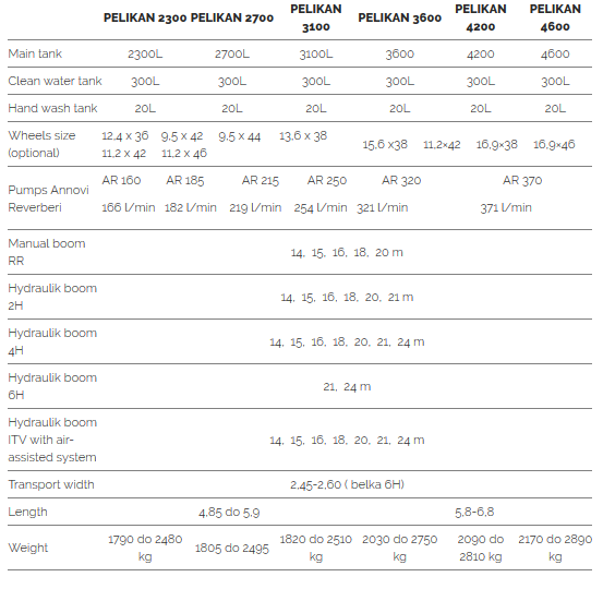 PELIKAN 2300, 2700, 3100, 3600, 4200, 4600 – it is the series of filed sprayers which are most often selected by owners of large and medium farms. They are available with booms of working width from 14 to 24 meters. The wide range of solutions available in our offer allows you to set up the most useful machine on your farm. Components used in production come from the best suppliers recognized in many countries. Thanks to this, the sprayers of this series are durable, reliable, and their operation is simple and safe. The choice of Pelican sprayer is a guarantee of long-term operation and precision of the performed treatments.
