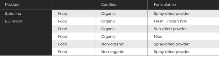 - Product: EU-origin. Pure microalgae powders with an extended shelf life, available as food grade spray-dried powders in green, light green, yellow and