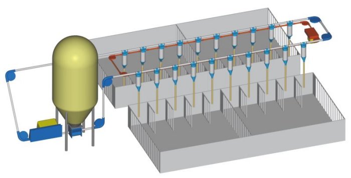 - A high-speed chain fills the feeders with a predetermined quantity of feed.