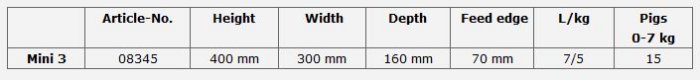 Mini 3 is the product ensuring that piglets are quickly and efficiently accustomed to dry feed. This feeder ensures easy access to the feed for all piglets, also the weak ones of the heard. The adjustable front plate ensures the optimal amount of feed, and the waste is reduced to a minimum. By means of a simple locking device the product is fixed without any use of tools, and it can be placed in the farrowing pen when required.