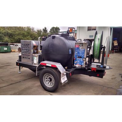 Our single axle trailer is available with water tank options ranging from 300 to 500 gallons and can be fitting with 1/2” or 3/4” hose. The frame is coated with a permanent speed liner which will prevent deterioration of the frame. An articulating (180 degree) hose reel is available on our single axle trailer jetter. Click the line below to learn more!