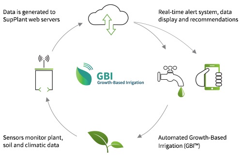 - SupPlant’s closed-loop solution: Growth-Based Irrigation (GBITM). The analyzed data is transmitted to an irrigation controller, resulting in a fully autonomous irrigation system based on analyzed plant sensing data, in real time. The GBI system is the first fully commercial closed-loop irrigation system. Today, GBI systems are installed in 14 of the largest agriculture markets in the world, in an ever growing range of crops and climatic regions. In every new market and new crop a “control” plot with the same variables (soil type, size, variety and age of the crop) as the “GBI” plot is being examined, enabling a comparison of the final season results between the plots. On average, the GBI plots use 30% less irrigation water and the yield is 5%-10% higher in comparison to the “control” plots. These results can reach higher values in the second and third season of using GBI.