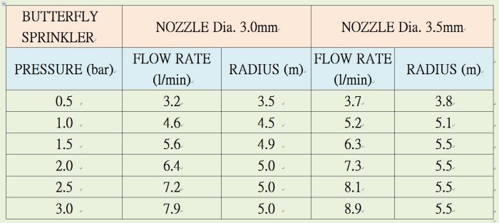 Butterfly sprinkler is a sprinkler irrigation system used in garden irrigation and farm irrigation. It is one of popular types of sprinkler irrigation for vegetable irrigation, flower irrigation, small lawn irrigation etc.