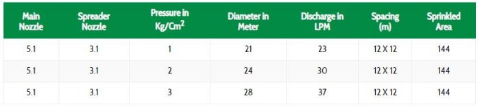 Features: Economically easy to install. Uniformity of water distribution very high even in windy conditions. Long Life Product made of high Quality engineering Plastic. Designed to ensure no damage to crop.