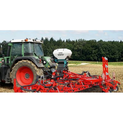The powerful pneumatic spreader with infinitely adjustable, high-powered 12 V fan. With the VENTO®, thanks to its extra strong 12 V fan, mixtures of fine and large seeds, catch and cover crops, slug pellets, micro-granulates, fertiliser and grass can be spread much more efficiently and cheaply than with a hydraulic machine. The VENTO® also masters high sowing rates (e.g. 40 kg/ha grass or 120 kg/ha seed) without problem. On the VENTO II, all functions and adjustments can be controlled on the control panel, and changed while on the move. Depending on which version of the VENTO® you have, working widths from 1 to 6 or 12 m can be achieved effortlessly.