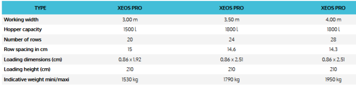 The Xeos PRO seed drill is available in working widths of 3, 3.5 and 4 metres and has a 1000 to 1800 litre hopper capacity