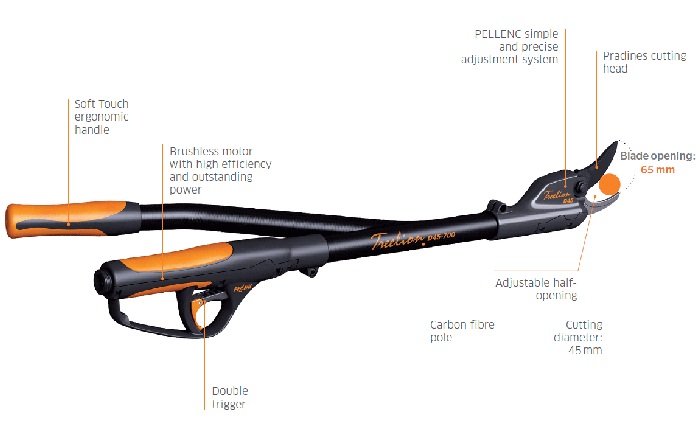 - PELLENC Brushless, frictionless, very high efficiency, and maintenance-free electric motor.