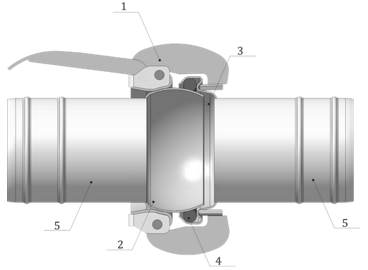 Quick-release coupling consists of the clamp 1, welded pipe 5 with sphere 2 and flange 3 with sealing ring 4 welded on it. The assembling is performed by coupling of the sphere 2 to the flange 3 via the sealing ring 4 and fastened by the clamp 1