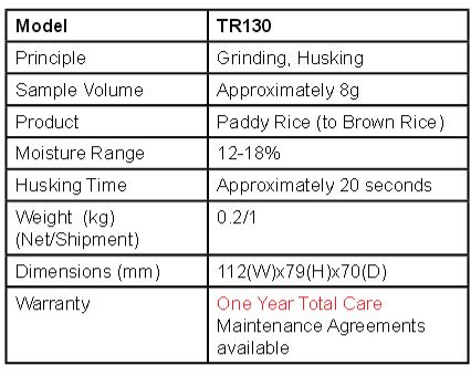 The operation is very clean as the test is completely enclosed. Each sample is approximately 8g. Since manual sample preparation is eliminated, using the TR130 improves the efficiency of a rice testing laboratory or grain elevator as it makes it easy to take a variety of moisture measurements. In addition, test results are more stable because of the improved brown rice consistency.