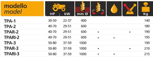 Equipment used to create vertical holes in the ground with various diameters, from 15 cm to 100 cm and at a depth until to 150 cm. The drive is ensured by a cardan shaft with a safety bolt. All the tips have interchangeable blades. There are various types of machines: a model for holes from 15 cm to 40 cm without a rotation reverser; a model for holes from 15 cm to 60 cm without reverser or with mechanical or hydraulic control rotation reverser; a model for holes from 15 cm to 100 cm without reverser or with mechanical or hydraulic control rotation reverser.