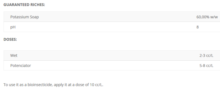 Potassium soap of natural origin, indicated as insecticide and as cleaner of the aereal parts of the crops of molasses and stains produced by insects and mites like whitefly, aphids, mealybugs. The product is an insecticide that does not creates resistances and that acts by contract, destroying the cell membrane of insects, mites and nymphs, as well as dissolving chitin from the insect exoskeleton. Because of its capacity dissolving the molasses, it allows to increases the sensitivity of insects against any other agrochemical and even get to dehydrate them causing his death. For that, it is recommended its use as humectant because mixed with other products acts as a potentiator of the insecticide effect.