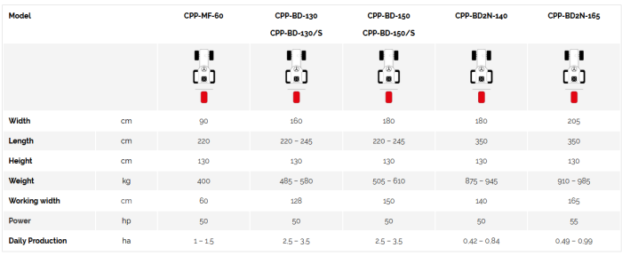 The potato digger CPP-BD2N-140/165 is designed for picking up potatoes, carrots, garlic, leeks, etc. The standard version is with share blade in whole width, with adjustable angle (A), two grass-cutting discs (one for each side), 2 sieving webs (B), one web shaker with adjustable intensity (C), two rear wheels adjustable singularly and two adjustable Tefl on windrow grates for a perfect windrow. The machine can be linked up to a tractor by the three-point linkage. The digging depth is regulated by the third upper point, by adjustable share angle and by the rear wheels. A rear soil compacting roller with large diameter (opt.) prepares the bed for the windrow. A second sieving web increases considerably the sieving capacity of the potato digger. The potato digger with two sieving belts can be delivered with a sieving-channel width of 1,40 m, 1,65 m. With version at 1,40 m width it is possible to dig 2 rows with an adjustable distance from 0,75 to 0,80 m., while with a width of 1,65 m. you can dig rows from 0,85 to 0,90 m. Standard sieving webs have a pitch of 36 mm.
