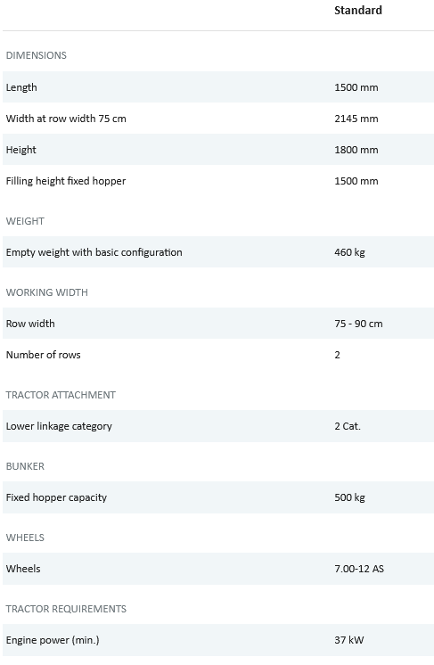 - Fixed furrow opener, simple height adjustment.