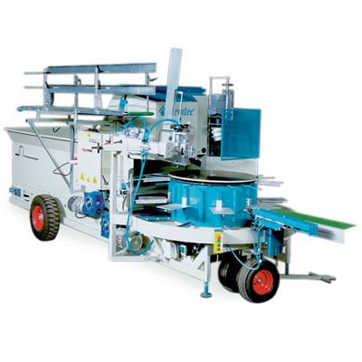 The 3016 fills both small pot sizes at high speed and larger pots (up to 35 cm) by means of a 1 on 2 adjustment. The machine is standard equipped with a powerful and speed-controlled drill setting. Big favourite of bed plant growers because this machine also easily processes flower baskets, and of tree nurseries where also larger pot sizes (besides 2l and 3l pots) can be processed. The machine however remains mobile, it has pneumatic tyres and a towing hook.
