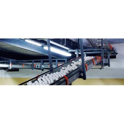 Automatic longitudinal egg collection by means of elevator system ""NORIA"" permit to collect eggs from all tiers simultaneously.
