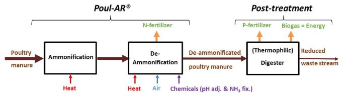 Within the Poul-AR® process, eco-innovative principles and technologies are applied, resulting into a sustainable route to nutrient recovery and energy efficiency from poultry manure. The approach makes use of subsequent biological and physico chemical treatment steps. The first step in the process is biological ammonification in which organic nitrogen is biologically converted into ammonia. The second step recovers ammonia present in the broth via air stripping.