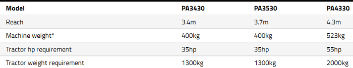 McConnel’s specialist compact Power Arm series combines the benefits of a light, fuel-efficient design with outstanding manoeuvrability and precision. Offering a choice of reach from 3.4m to 4.3m and deceptively powerful 30hp hydraulics, 30-series Power Arms can be fitted to a wide range of utility vehicles and compact tractors. The PA3430 and PA4330 can be mounted to the front or rear, while the PA3530 model is front-mounting only.