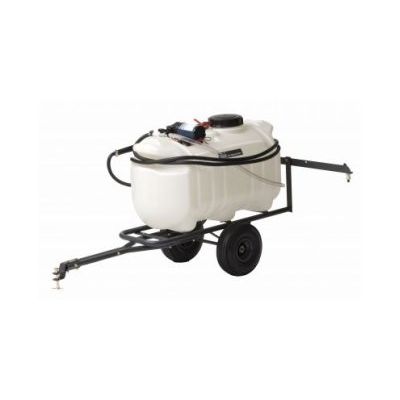 25 Gallon Trailing Sprayer. Capacity: 25 Gallon. Frame Description: Tubluar Frame. Body Design: Opaque Tank with Gallon Call Outs & Drain Plug. Wheels: 10` Pneumatic Tires. Hardware: Yellow Dichromate Finished. Hitch: Hitch Pin Included. Swath:7`. Assembly Time (Minutes):15. Handgun:Thumb Control with Adjustable Tips and 15` Hose. Boom: Two Nozzle, 7` Coverage. Pump: 12 Volt, 2 GPM, 60 PSI, 8` Detachable Power Harness with Heavy Duty Batter Clamps & On/Off Switch. UPC: 0-26432-35046-9.