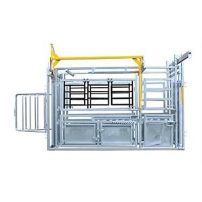 3mm gauge steel frame. Walk through vet section. Baulk gate. Kick latch. Rump squeeze. New design allows safer access to rear of animal. Triple top gates allowing full access along animal. Double lower doors on each side for hoof access. Sheeted sliding gate.