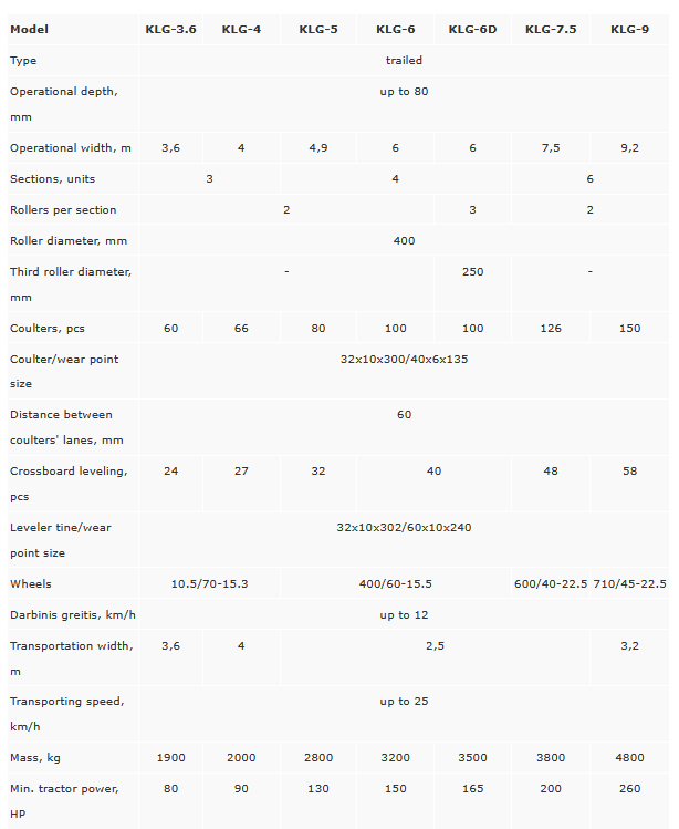 Laumetris Ltd. produces trailed soil tillage implements - cultivators KLG of 3,6; 4; 5; 6; 7; 9; 12 m. width. Cultivator is used for accurate soil cultivation in order to seed sugar beets, linen, rape and cereal in precise regulated depth. Depth of tillage – up to 80 mm. Every tillage aggregate consists of three or more sections (depends on implement’s width) and it allows to copy relief of soil surface very accurately. Each section has front and back supporting rollers, leveler and coulters (ploughshares). Front roller crumbles clods, then leveler collates the surface. 40 mm. width coulters with spring tines are placed between leveler and back roller and have 60 mm. distance with each other.