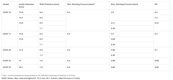 Miniature economical CAS dripper to maintain uniform flow rate at wide range of working pressures and various topography.Anti-siphon mechanism to prevent aspiration through dripper outlet. Prevents sa nd and soil penetration into dripper. Ideal for use in SDI (Subsurface Drip Irrigation). Contains the most reliable and proven PC mechanism by regulating labyrinth of ADI and VERED drippers. Dripper flow rates: 0.9, 1.2 , 1.6, 2.1, 3.4 l/h. ASSIF dripline available in wide range of wall thicknesses between 0.4 to 1.2 mm. ASSIF dripline available in wide range of lateral diameters: 16, 17, 20, 22 and 25 mm. Rootguard® configuration available for extra root protection in SDI. Filtration system should be at least 120 mesh.