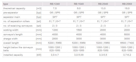 The RB Receiving Hopper is ideal for unloading of rear dump agricultural trailers. The main conveyor is powered by a gear with regulated operation speed (variable-speed transmission unit). The hopper is equipped with an integrated (single or double) clod separator module with adjustable operation angle and spacing and two or three (refers to the version with a double clod separator) receiving conveyors. The spacing of the separating elements and the operation angle are regulated by an automatic transmission gear. The separator module can be star-shaped or consist of adjustable spirals (polyurethane or steel) and steel rollers.